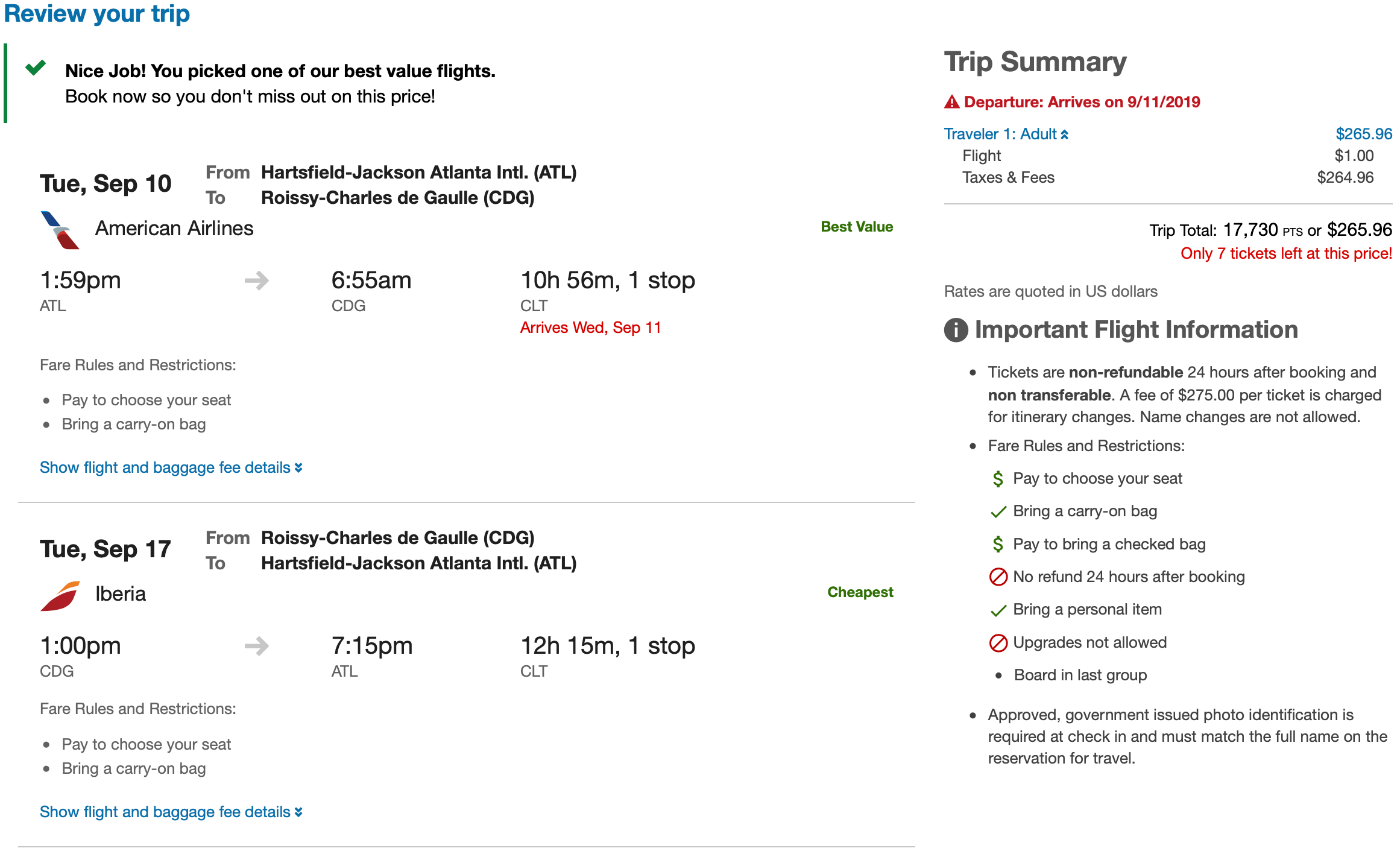 Atlanta (ATL) to Paris (CDG) for $266 or 17,730 points round-trip in American basic economy: