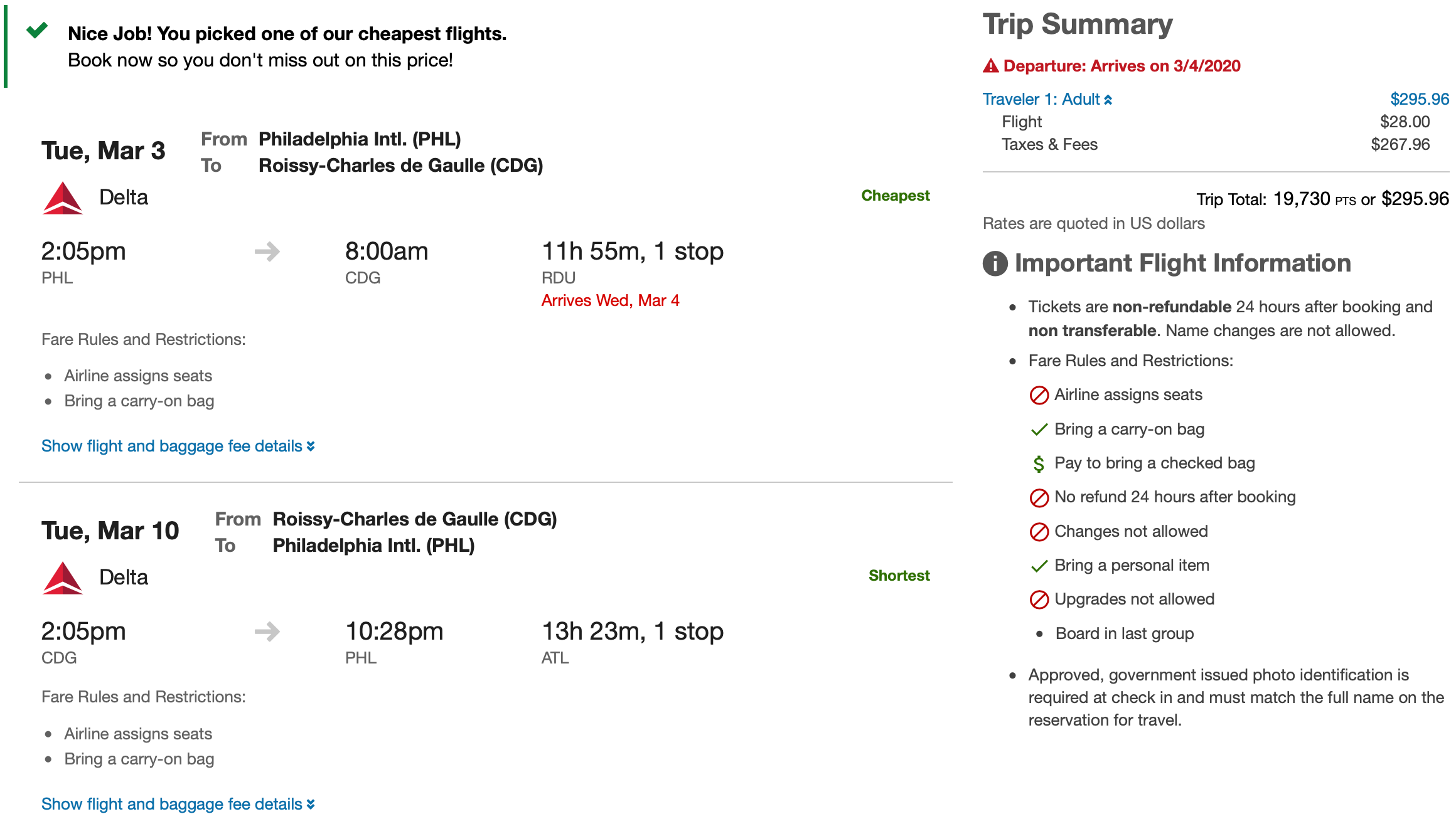 Philadelphia (PHL) to Paris (CDG) for $296 or 19,730 round-trip in Delta basic economy: