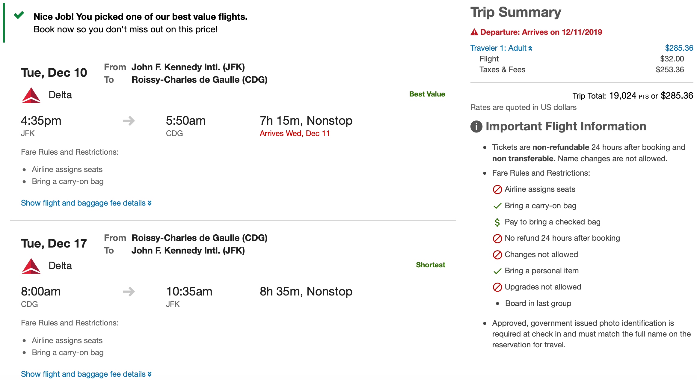 New York (JFK) to Paris (CDG) for $285 or 19,024 round-trip in Delta basic economy: