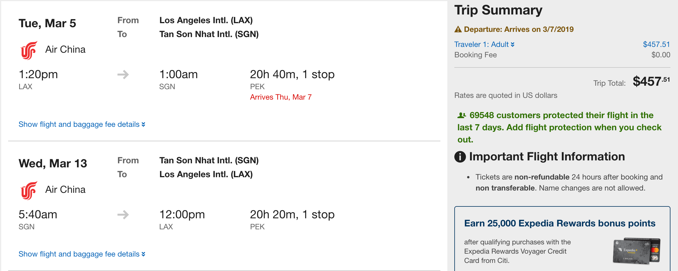 Los Angeles (LAX) to Ho Chi Minh City (SGN) for $458 round-trip on Air China via Expedia: