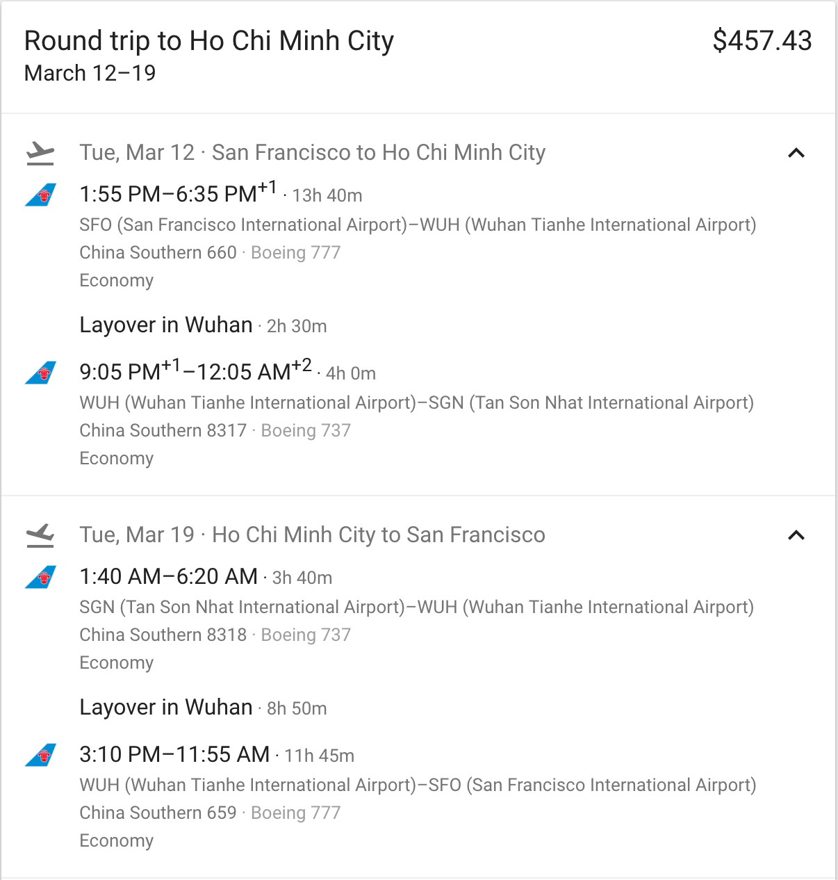 San Fransisco (SFO) to Ho Chi Minh City (SGN) for $457 round-trip on China Southern via Priceline: