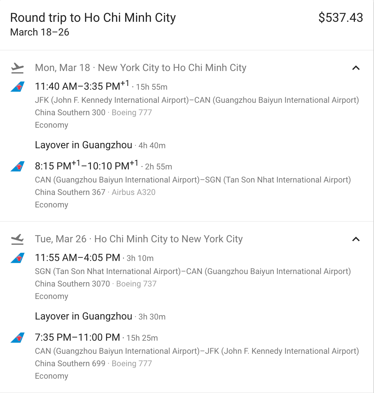 New York (JFK) to Ho Chi Minh City (SGN) for $537 round-trip on China Southern via Priceline: