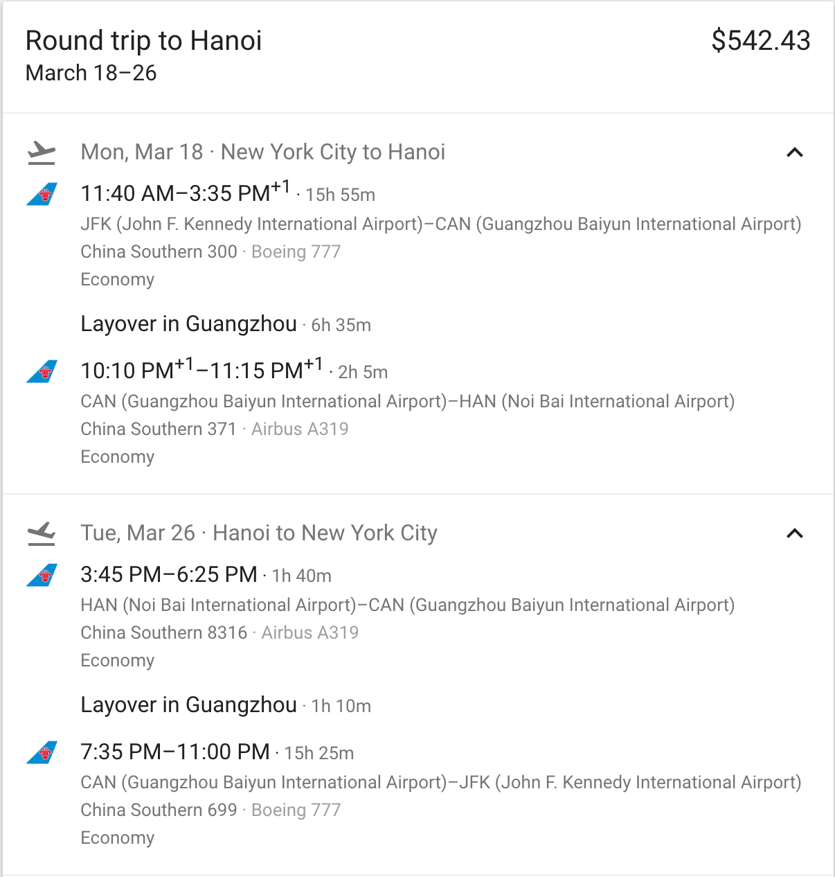 New York (JFK) to Hanoi (HAN) for $542 round-trip on China Southern via Priceline: