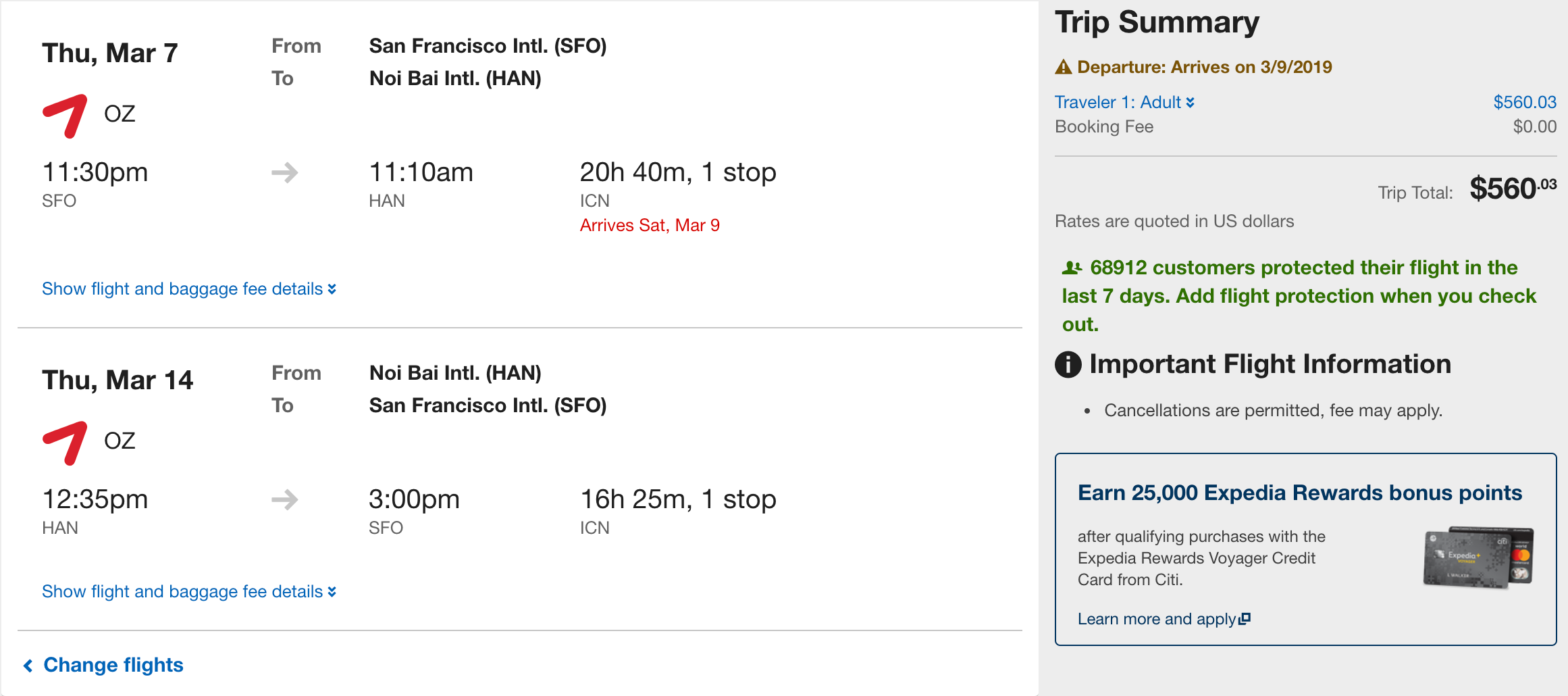 San Fransisco (SFO) to Hanoi (HAN) for $560 round-trip on Asiana via Expedia:
