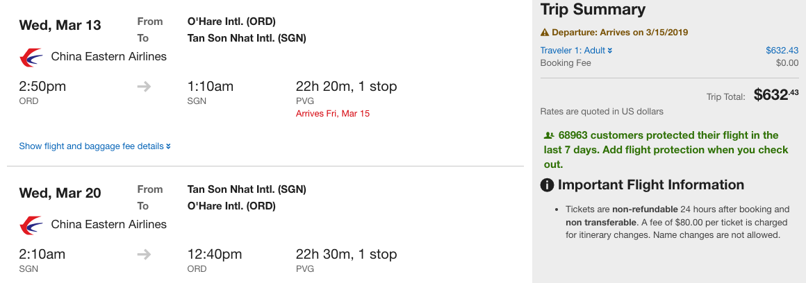 Chicago (ORD) to Ho Chi Minh City (SGN) for $632 round-trip on China Eastern via Expedia: