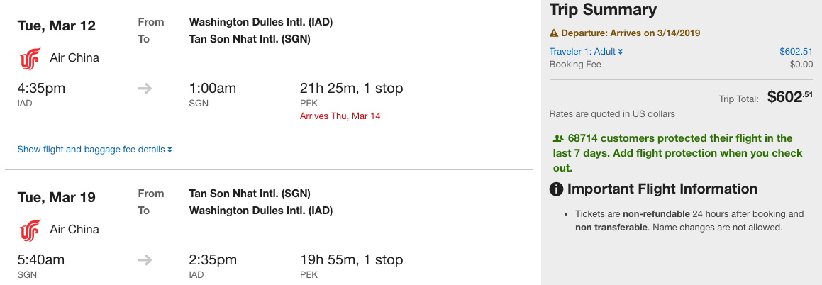 Washington DC (IAD) to Ho Chi Minh City (SGN) for $603 round-trip on Air China via Expedia: