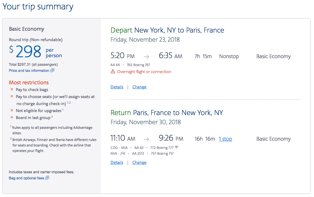 New York (JFK) to Paris (CDG) for $298 round-trip nonstop on American Airlines in November in basic economy: