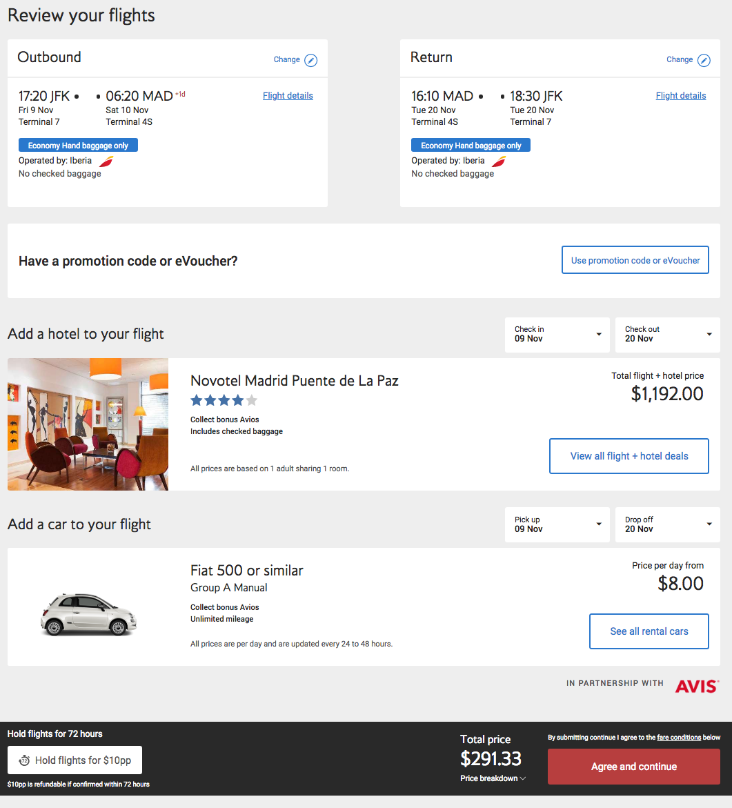New York (JFK) to Madrid (MAD) for $291 round-trip on Iberia in November in basic economy: