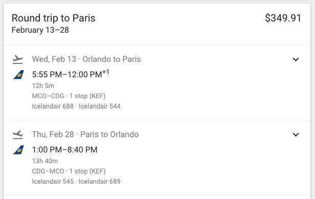 Orlando (MCO) to Paris (CDG) for $350 round-trip on IcelandAir via Priceline in February in basic economy: