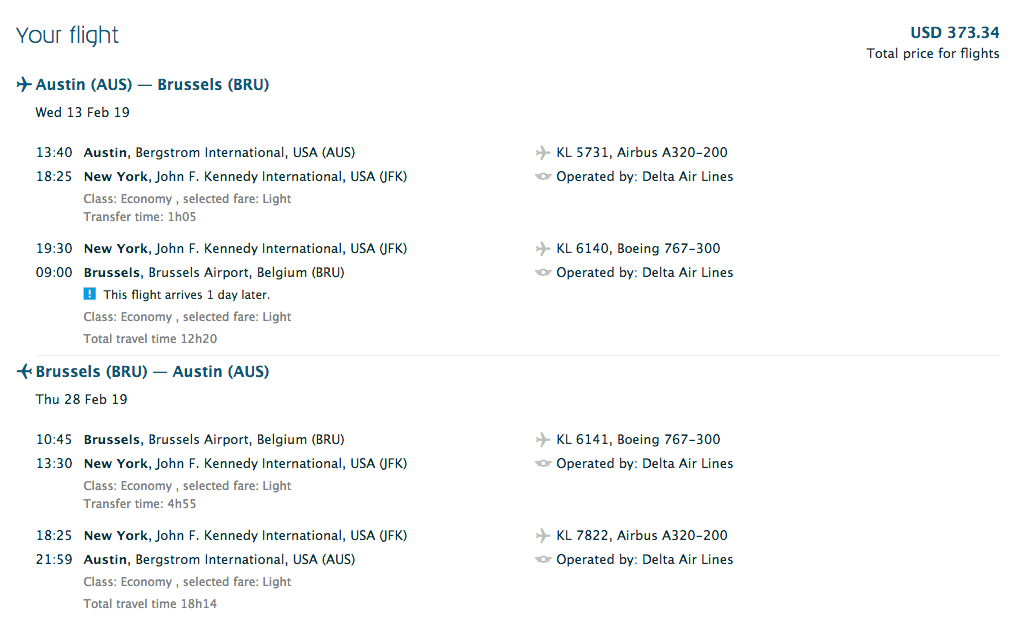 Austin (AUS) to Brussels (BRU) for $373 round-trip on KLM in February in basic economy: