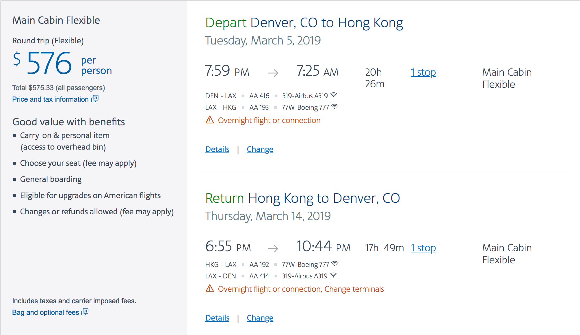 Denver (DEN) to Hong Kong (HKG) for $576 round-trip on American Airlines: