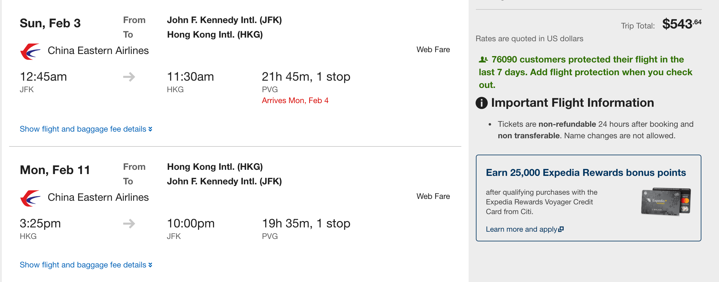 New York (JFK) to Hong Kong (HKG) for $543 round-trip on China Eastern Airlines via Expedia: