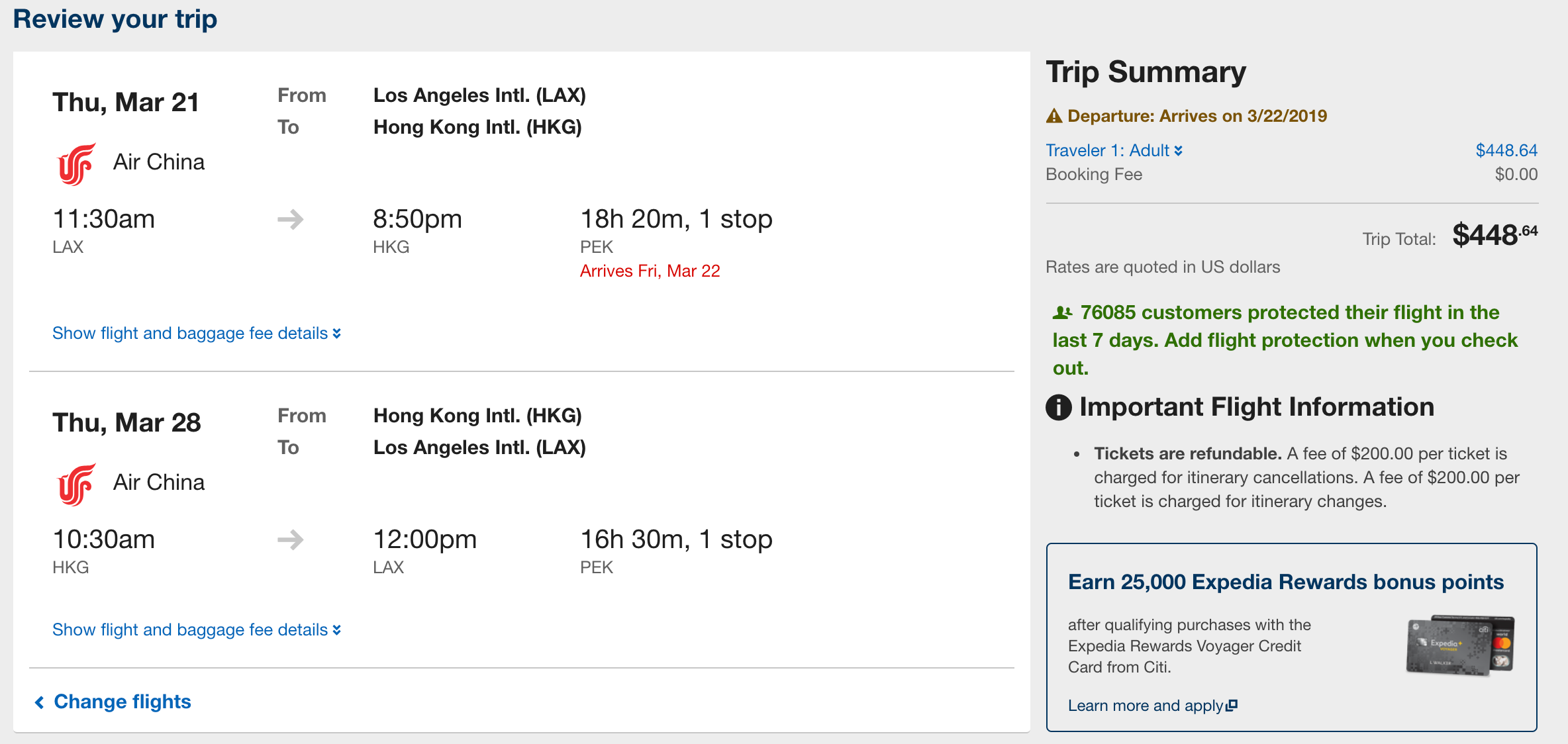 Los Angeles (LAX) to Hong Kong (HKG) for $449 round-trip on Air China via Expedia: