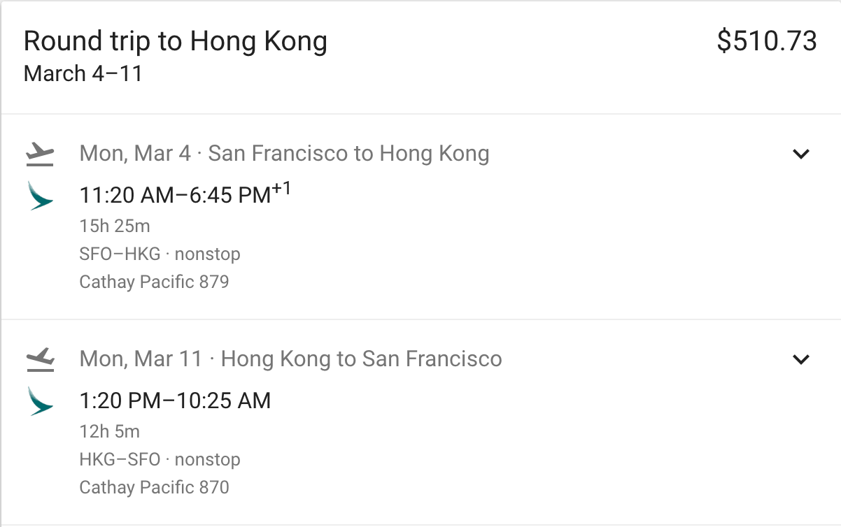 San Fransisco (SFO) to Hong Kong (HKG) for $511 round-trip on Cathay Pacific via Priceline: