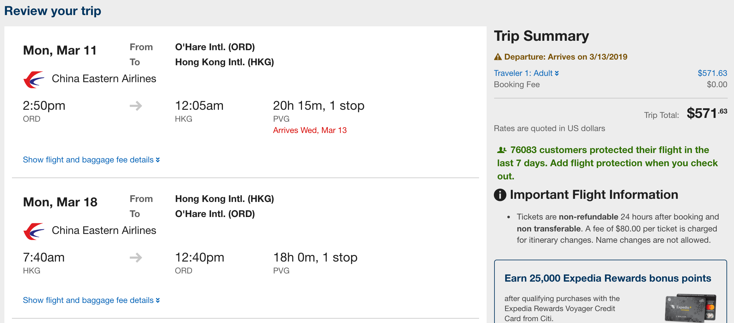 Chicago (ORD) to Hong Kong (HKG) for $572 round-trip on China Eastern Airlines via Expedia: