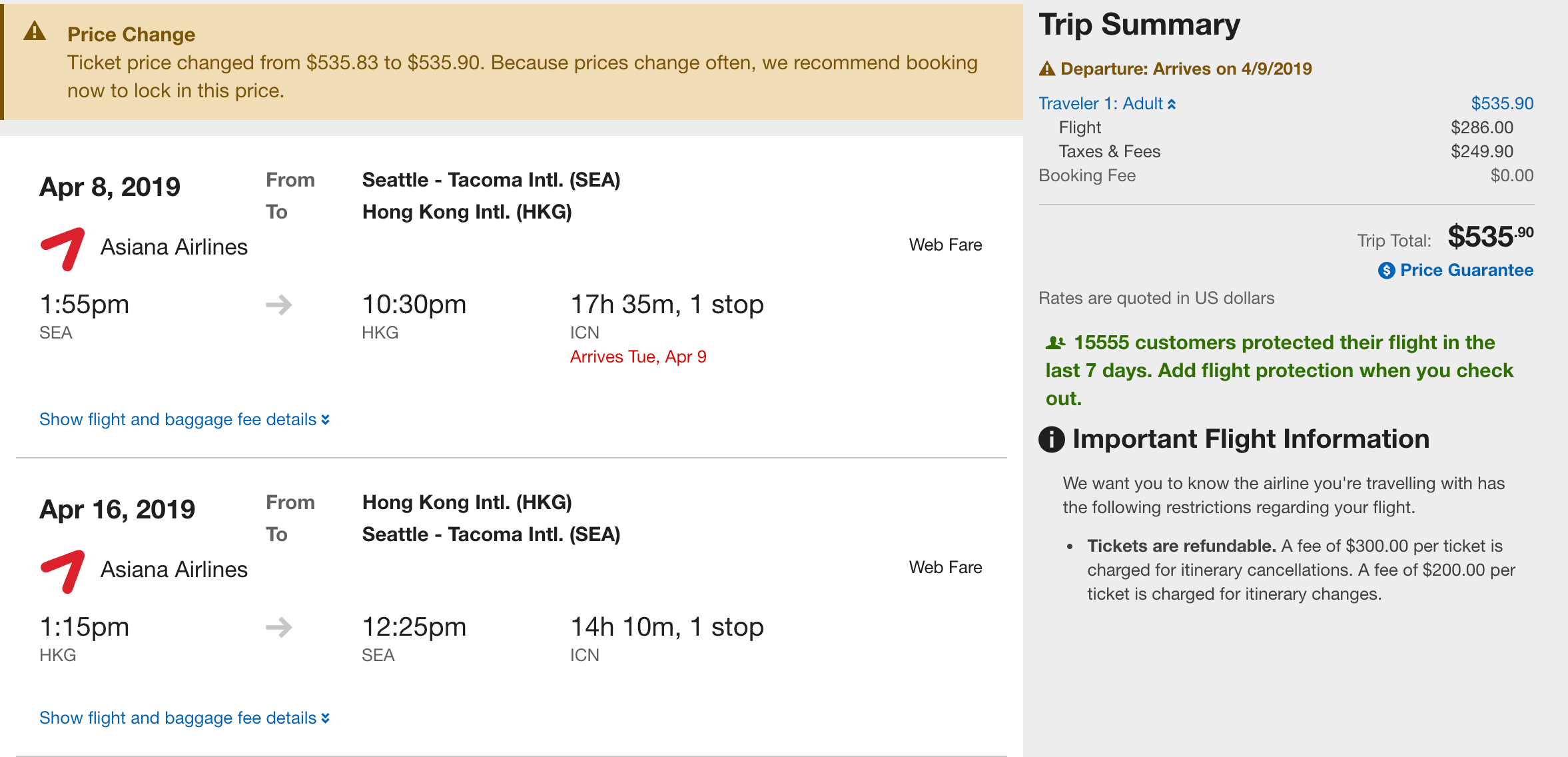 Seattle (SEA) to Hong Kong (HKG) for $536 round-trip on Asiana Airlines via Orbitz: