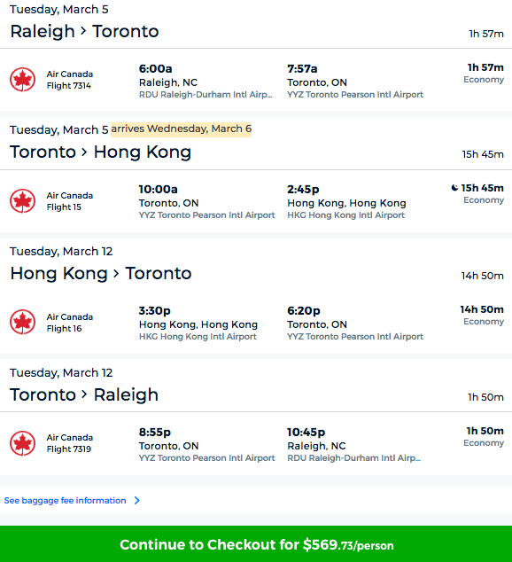 Raleigh-Durham (RDU) to Hong Kong (HKG) for $570 round-trip on Air Canada via Priceline: