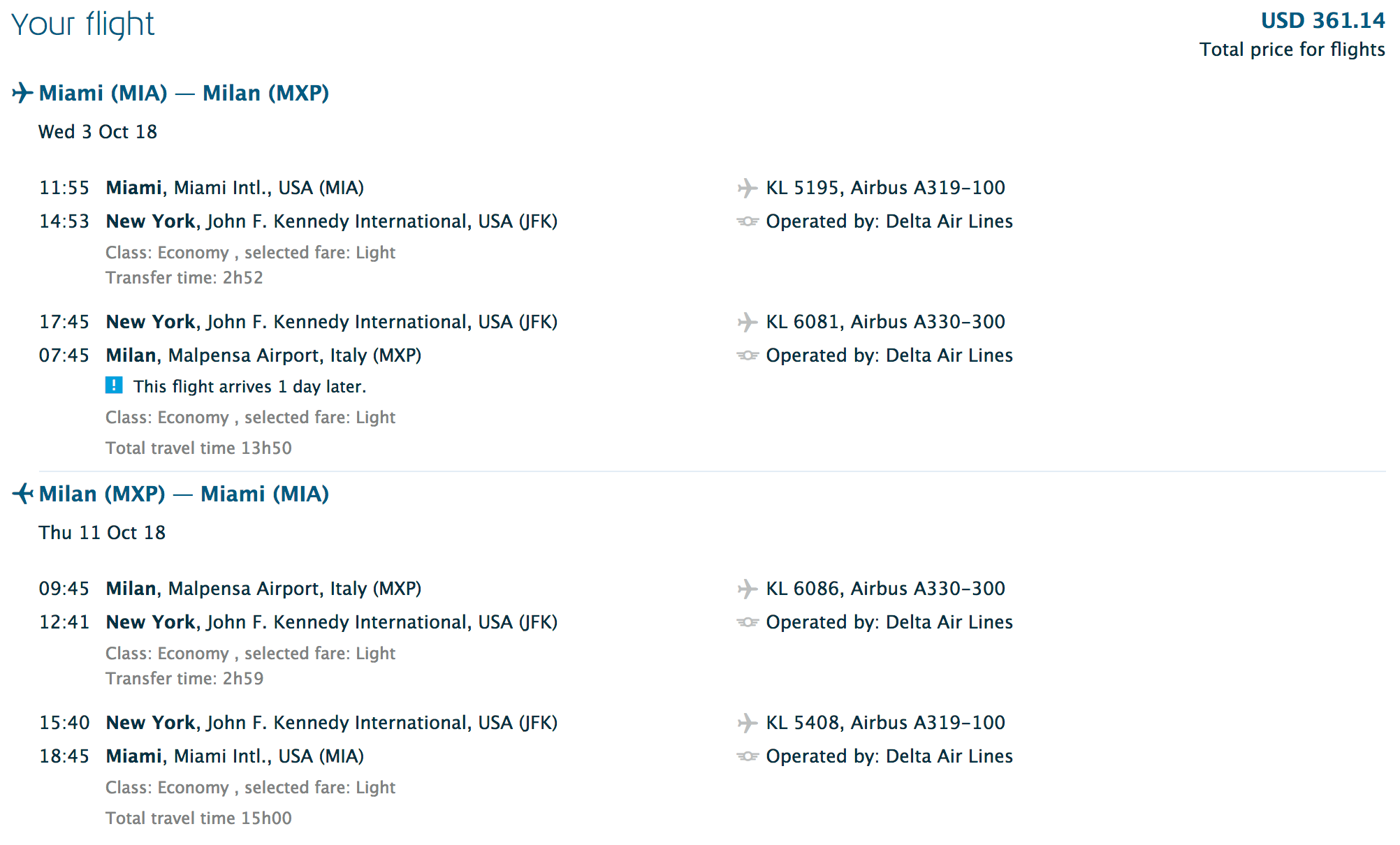 Miami (MIA) to Milan (MXP) for $361 round-trip on Delta via KLM: