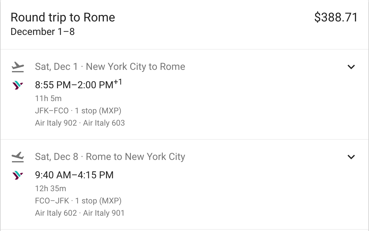 New York (JFK) to Milan (MXP) for $389 round-trip on Air Italy via Priceline: