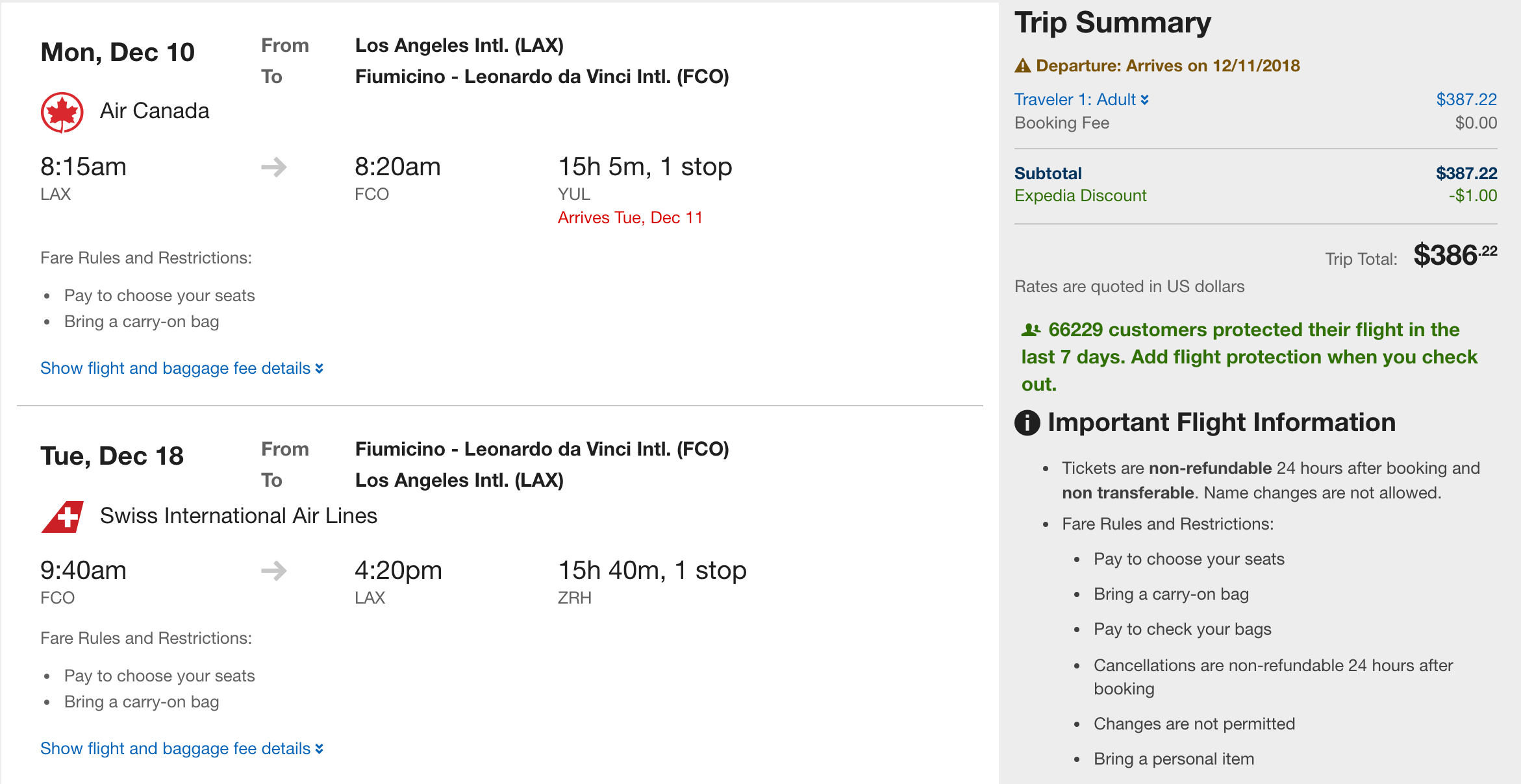 Los Angeles (LAX) to Rome (FCO) for $386 round-trip on Air Canada/Swiss via Expedia: