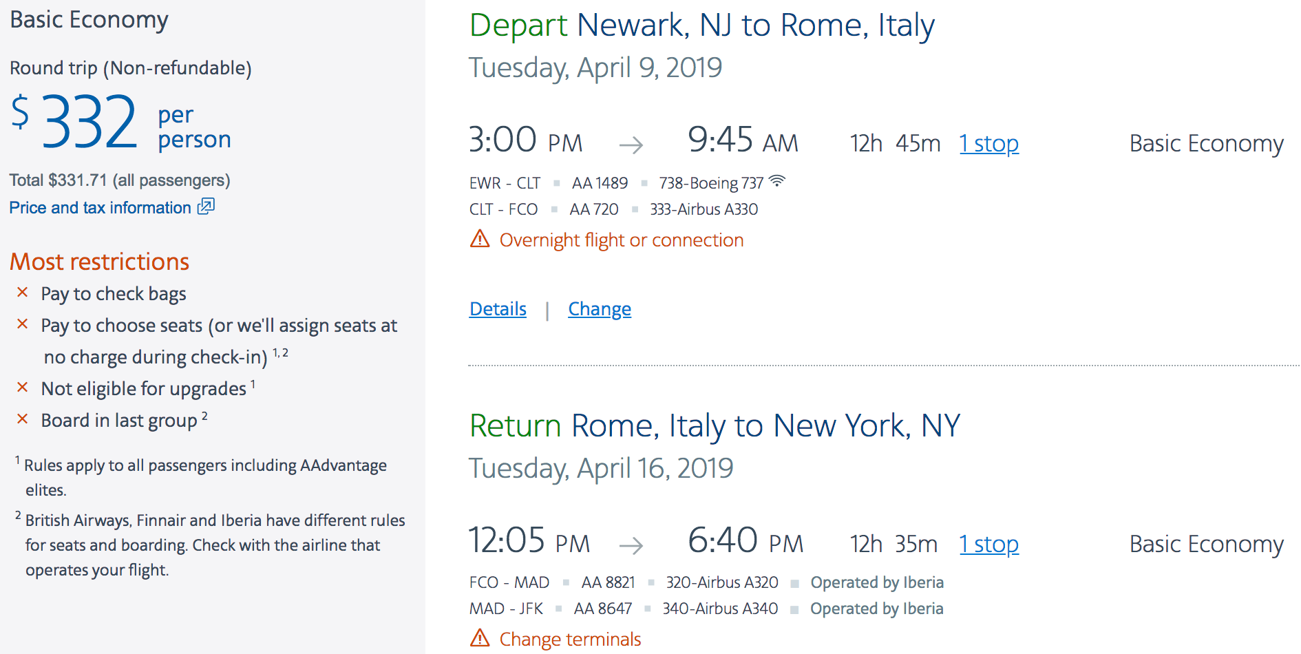 Newark (EWR) to Rome (FCO) for $332 round-trip on American: