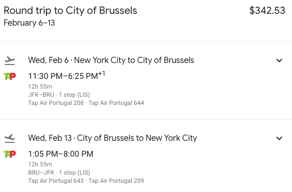 New York (JFK) to Brussels (BRU) for $343 round-trip on TAP Portugal via Priceline: