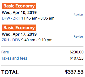 Dallas (DFW) to Zurich (ZRH) for $338 round-trip on United: