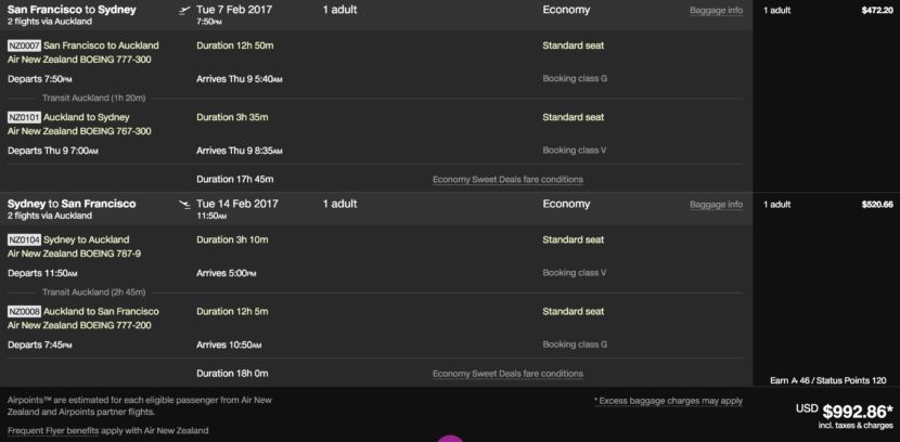 Air New Zealand just shared the details of a fare sale, with round-trip flights starting at $995 from the US to multiple Australian destinations. The sale is valid for departures from January 26, 2017 through May 31, 2017. You can fly from Houston (IAH), Los Angeles (LAX) and San Francisco (SFO) to Adelaide (ADL), Brisbane (BNE), Cairns (CNS), Gold Coast (OOL), Melbourne (MEL), Perth (PER) and Sydney (SYD). Air New Zealand is known for its Skycouch product, which turns a row of economy seats into a bed or couch as well as its stylish business class cabins in both the 787 and 777-300.