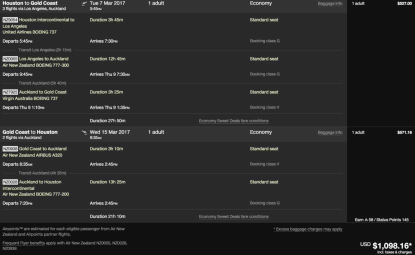 Houston (IAH) to Gold Coast (OOL) for $1,098 round-trip in March: