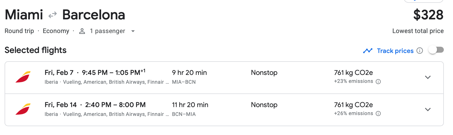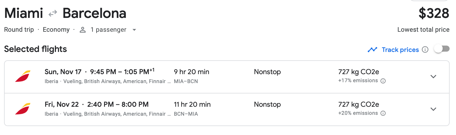 The best deals in this sale are out of Miami. Iberia has nonstop flights from Miami International Airport (MIA) to Josep Tarradellas Barcelona-El Prat Airport (BCN) in November for as low as $328.