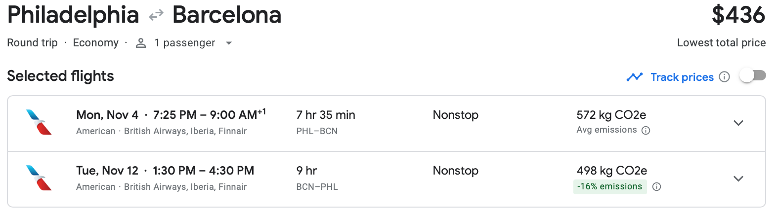 American Airlines has nonstop flights from Philadelphia International Airport (PHL) to Barcelona in November priced at for $436 round-trip, a big difference from the normal fare.