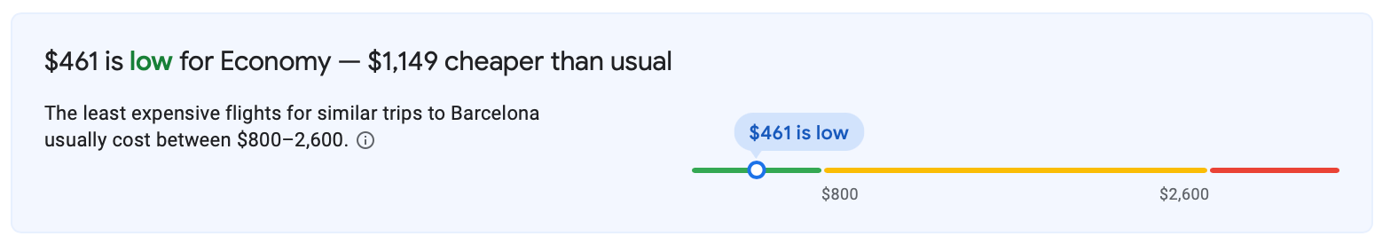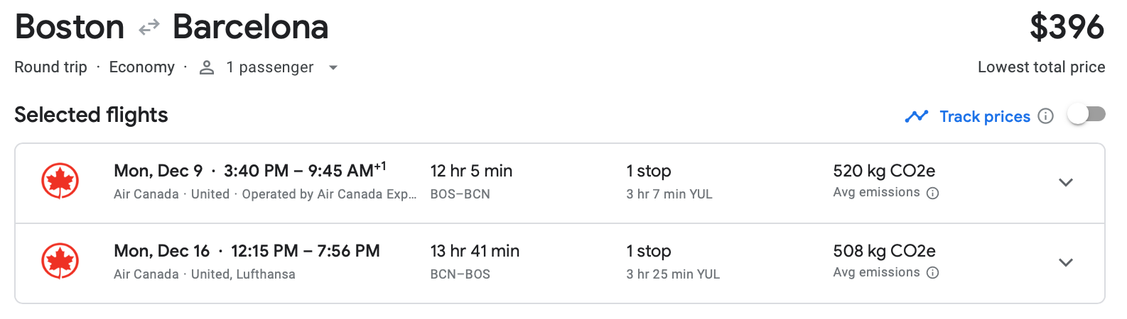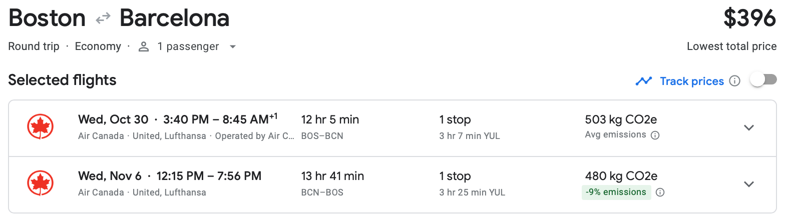 November is the month with the best prices in this sale. If you live in Boston, you can fly Air Canada from Boston Logan International Airport (BOS) to Barcelona, with a layover in Montreal, for less than $400 round-trip.
