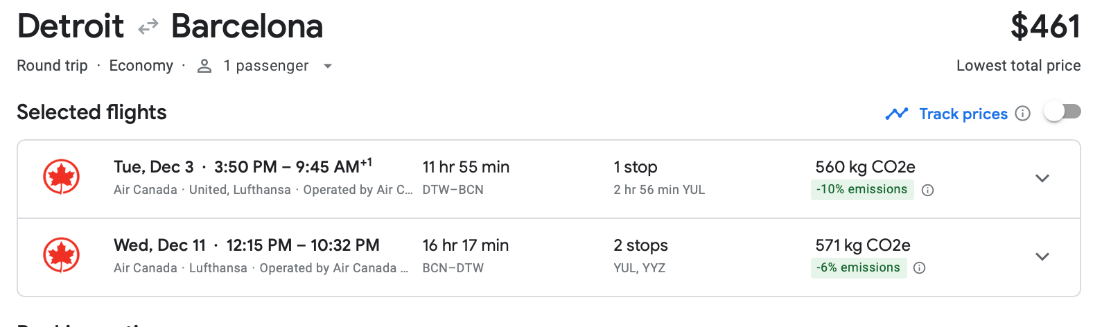 There are good deals to be had out of Detroit, too. Air Canada has round-trip fares from Detroit Metropolitan Wayne County Airport (DTW) to Barcelona in early December for $461. This route has a layover in Montreal.