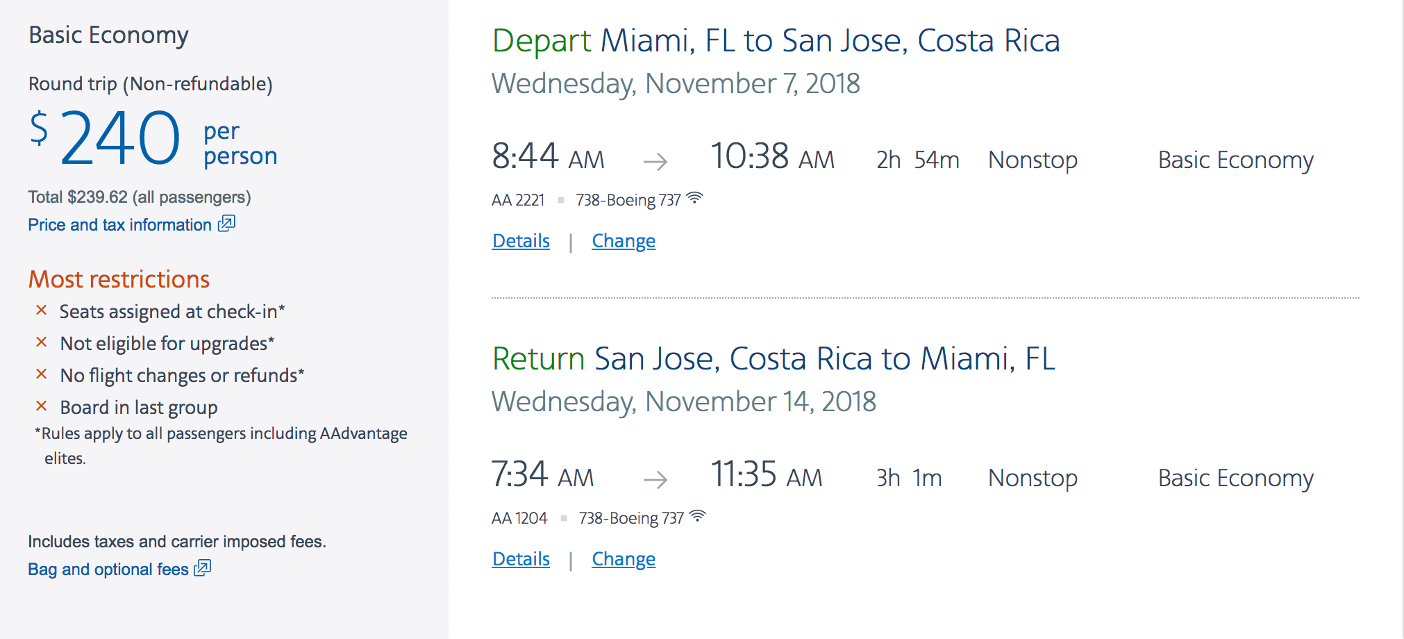 Miami (MIA) to San José (SJO) for $240 round-trip on American Airlines: