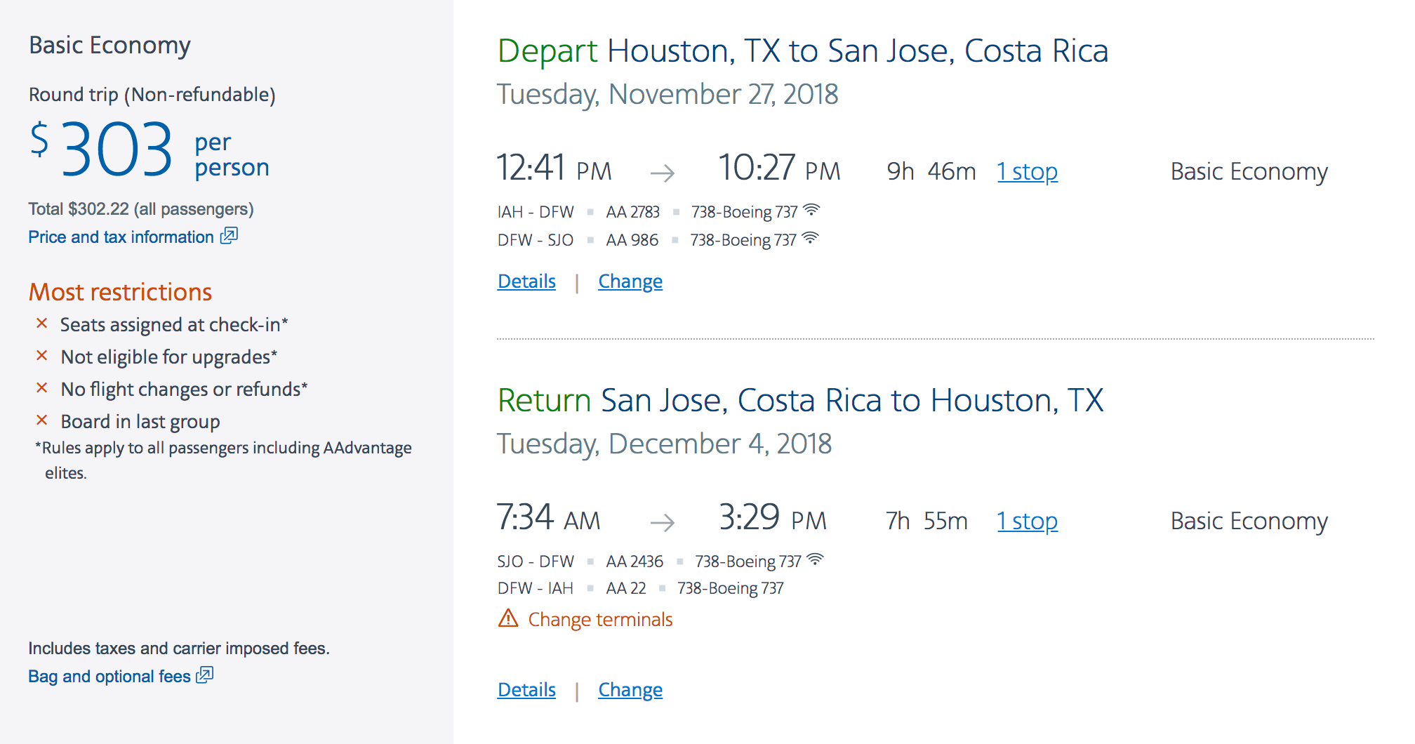 Houston (IAH) to San José (SJO) for $303 round-trip on American Airlines: