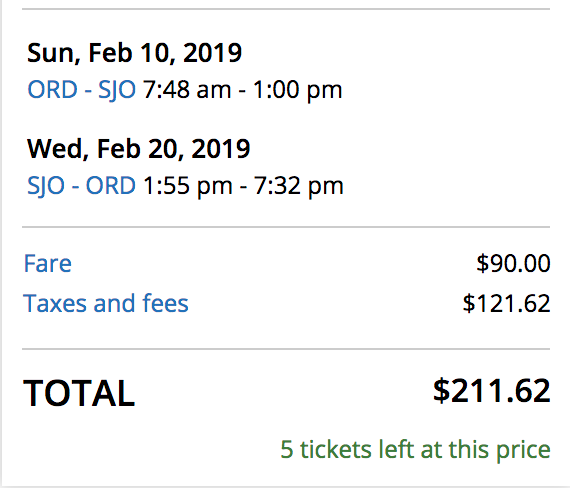 Chicago (ORD) to San José (SJO) for $212 round-trip on United: