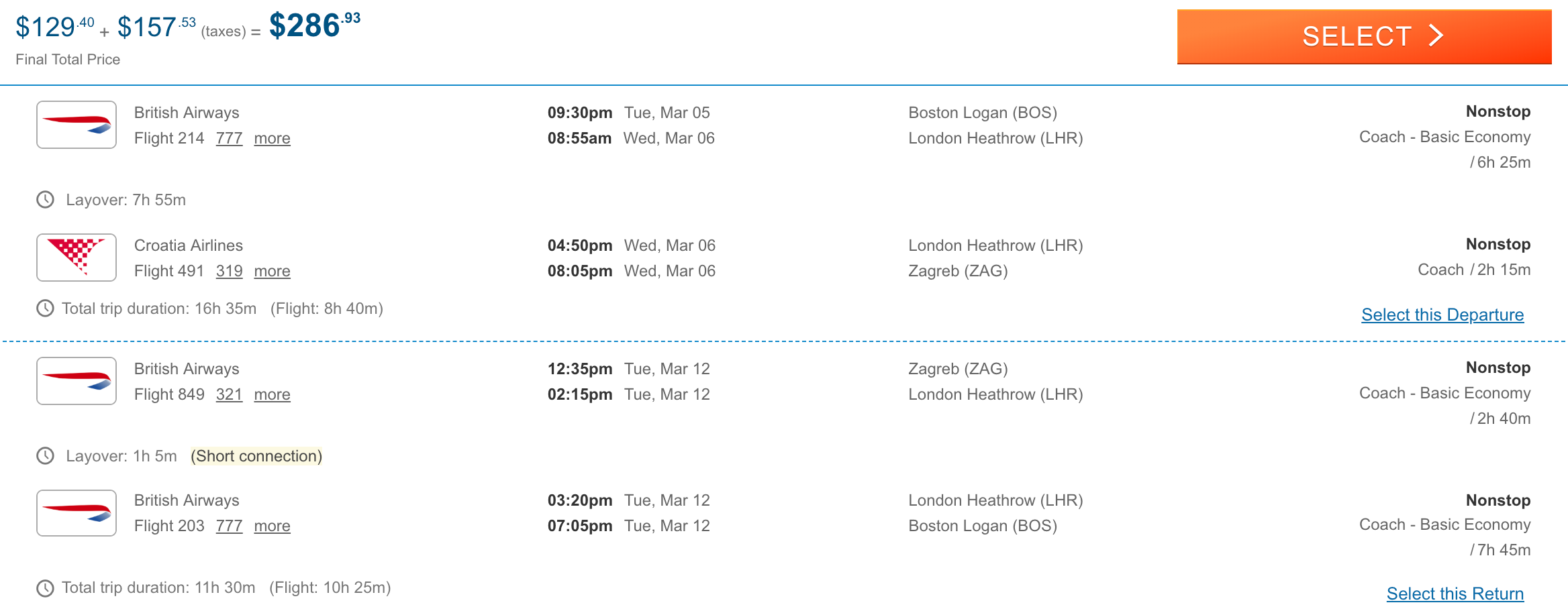 Boston (BOS) to Zagreb (ZAG) for $287 round-trip via CheapOair: