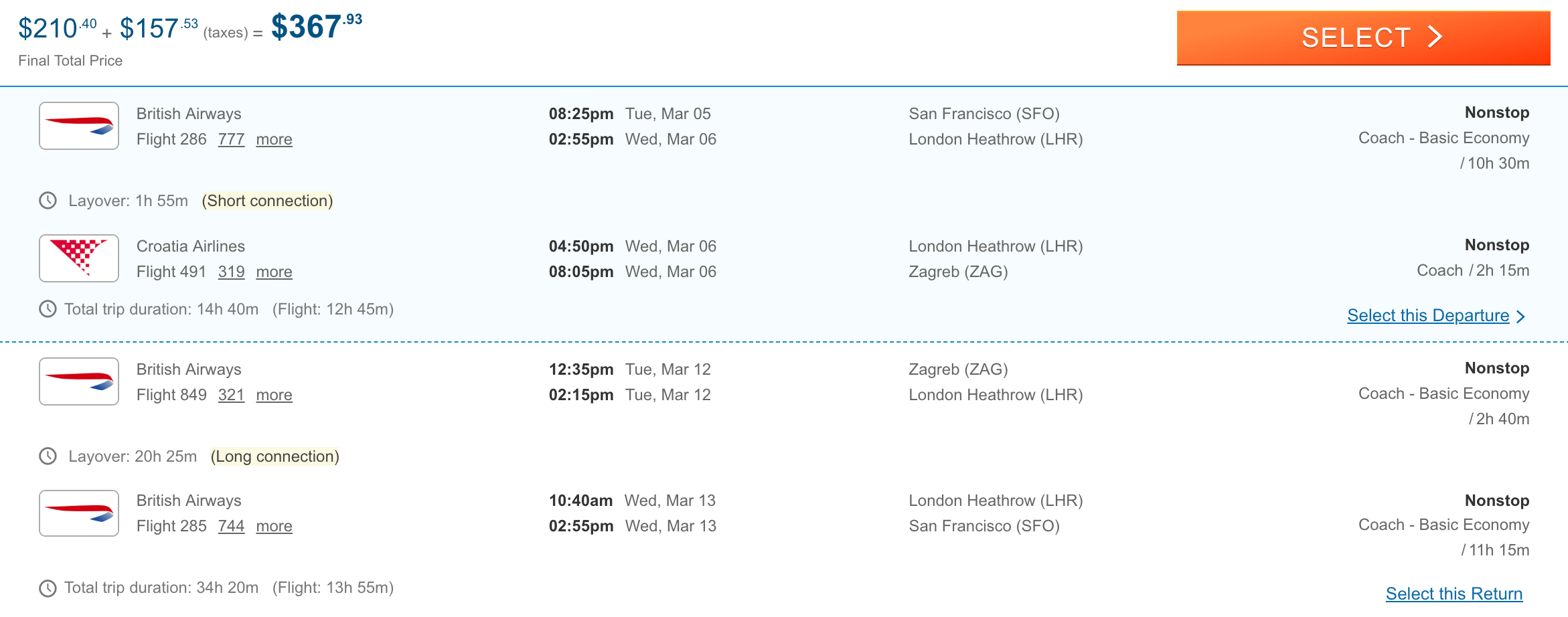 San Francisco (SFO) to Zagreb (ZAG) for $368 round-trip via CheapOair: