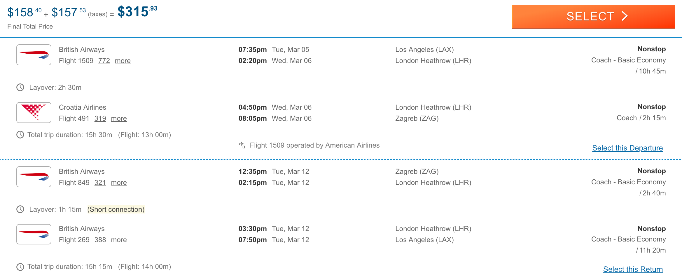 Los Angeles (LAX) to Zagreb (ZAG) for $316 round-trip via CheapOair: