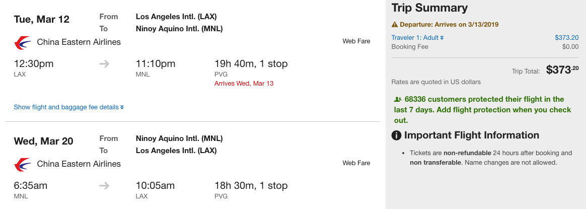 Los Angeles (LAX) to Manila (MNL) for $373 round-trip on China Eastern via Expedia: