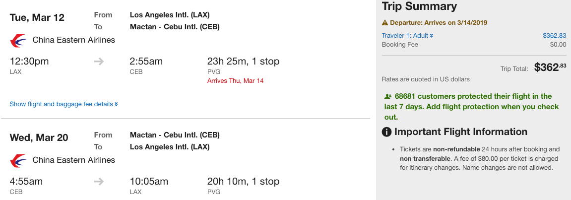 Los Angeles (LAX) to Cebu (CEB) for $363 round-trip on China Eastern via Expedia: