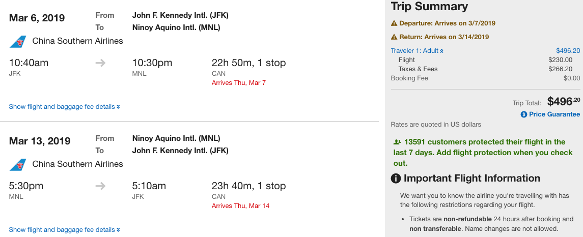 New York (JFK) to Manila (MNL) for $496 round-trip on China Southern via Expedia: