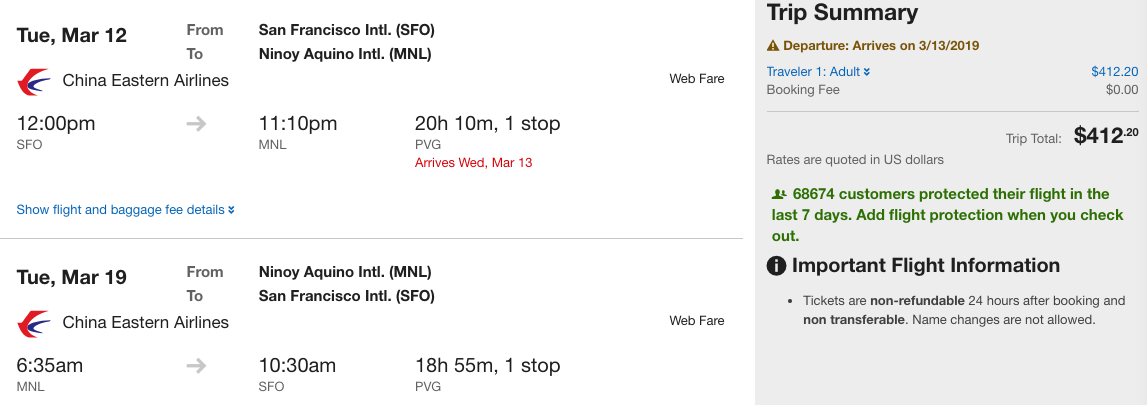 San Francisco (SFO) to Manila (MNL) for $412 round-trip on China Eastern via Expedia: