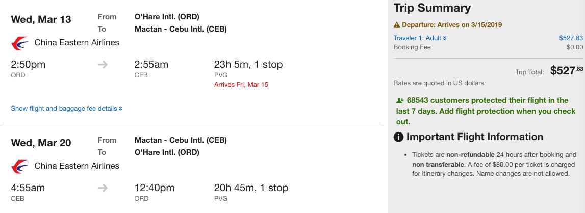 Chicago (ORD) to Cebu (CEB) for $528 round-trip on China Eastern via Expedia: