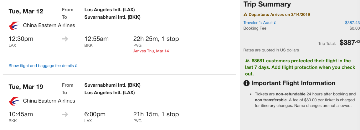 Los Angeles (LAX) to Bangkok (BKK) for $387 round-trip on China Eastern via Expedia: