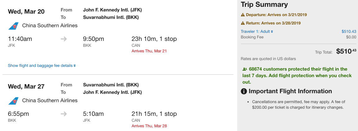 New York (JFK) to Bangkok (BKK) for $510 round-trip on China Southern via Expedia: