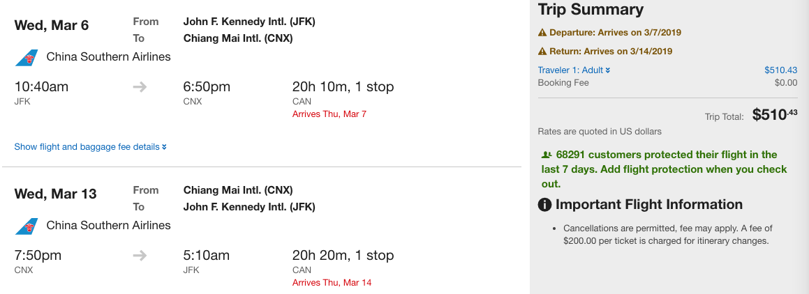 New York (JFK) to Chiang Mai (CNX) for $510 round-trip on China Southern via Expedia: