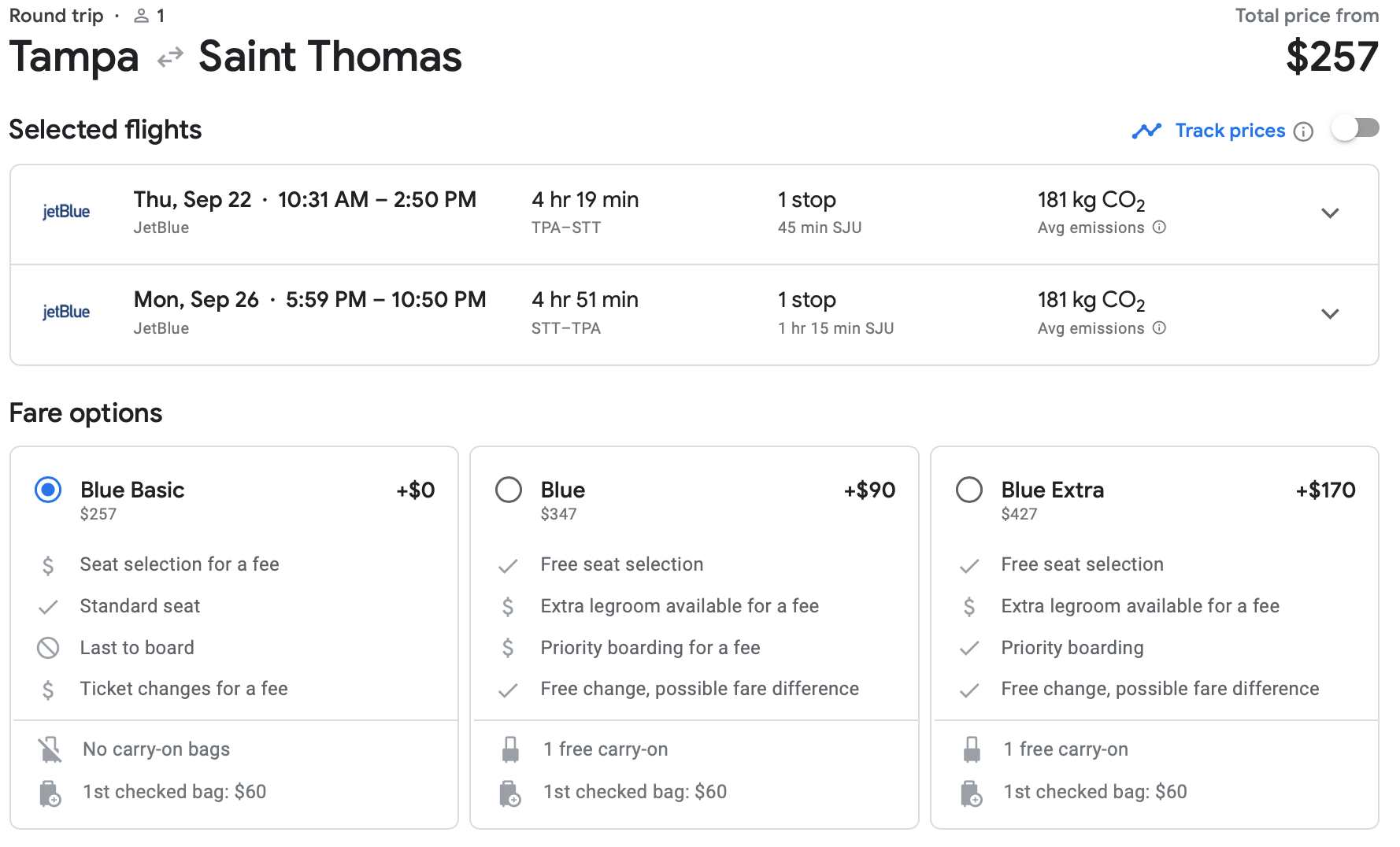 You can fly JetBlue from Tampa International Airport (TPA) to St. Thomas in September for $257 round trip. There is a brief layover in San Juan, Puerto Rico. Also, this is a Blue Basic, so you don't get a full-size carry-on bag.