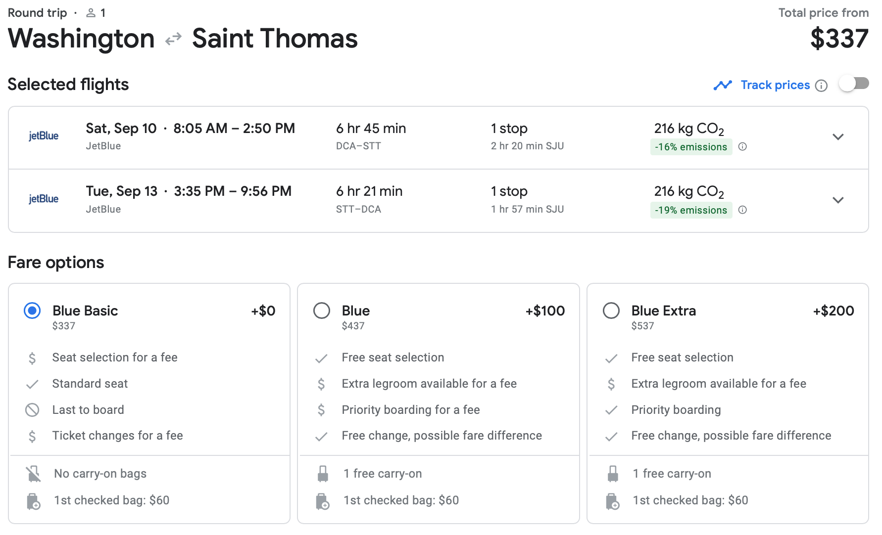 If you live in the nation's capital, JetBlue has some nice fares to the USVI. You can fly in September out of Ronald Reagan Washington National Airport (DCA) to St. Thomas for $337 round trip. It's a blue basic fare, so no full-size carry-on and there is also a layover in San Juan.