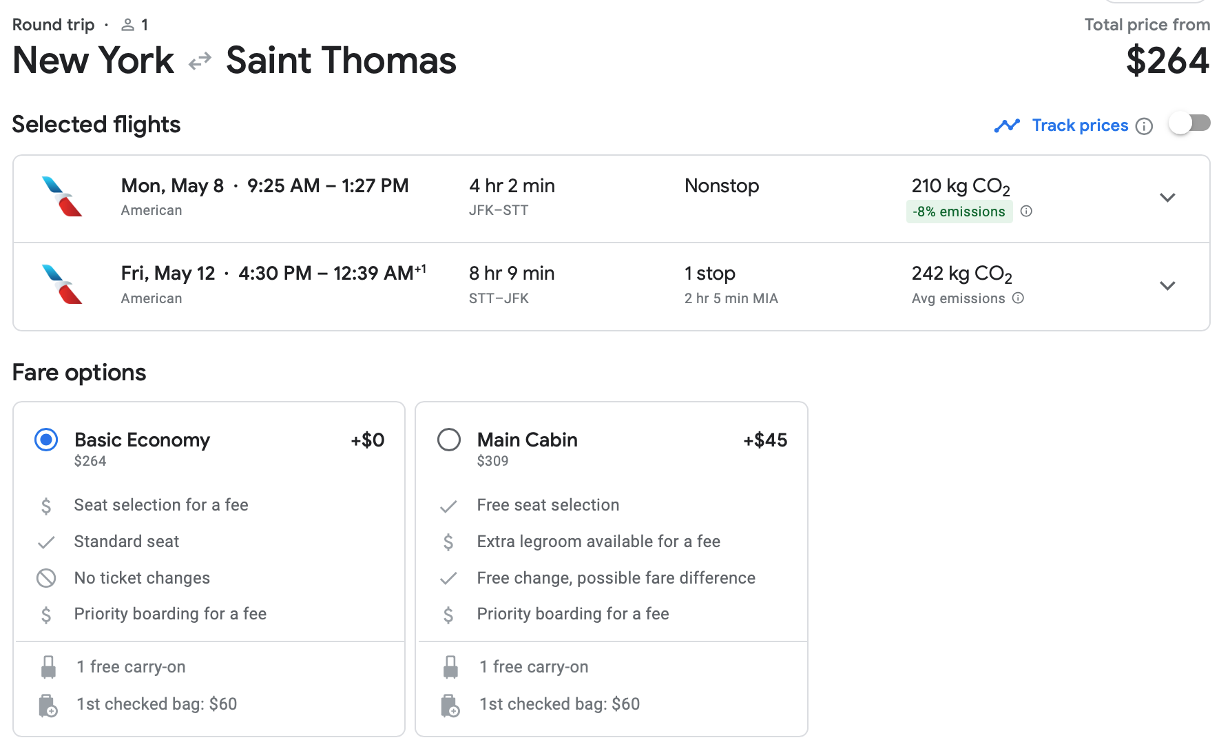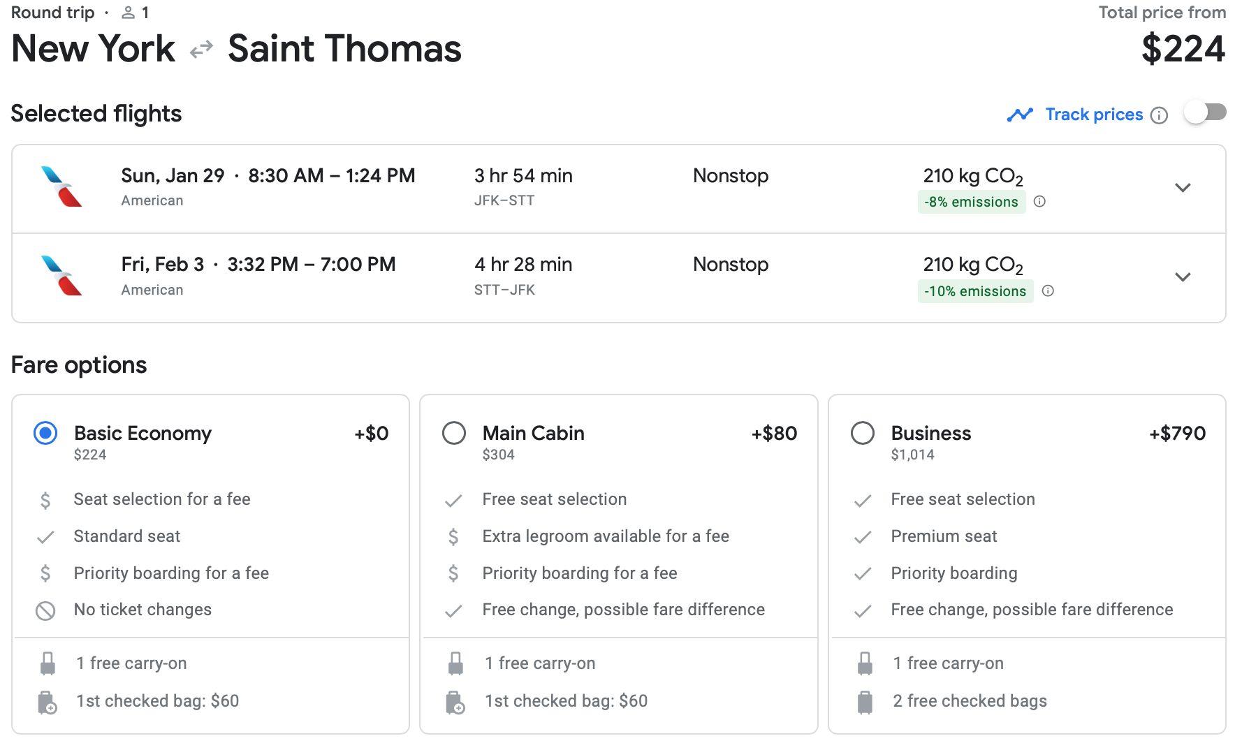 American has nonstop flights in late January from New York's John F. Kennedy International Airport (JFK) to Cyril E. King Airport (STT) in St. Thomas that are only $224 nonstop. It's a basic economy ticket, which means you get a free carry-on bag, but a checked bag will cost you $60 round trip.